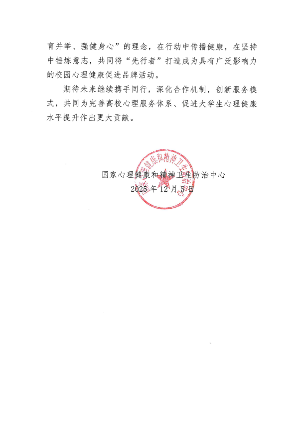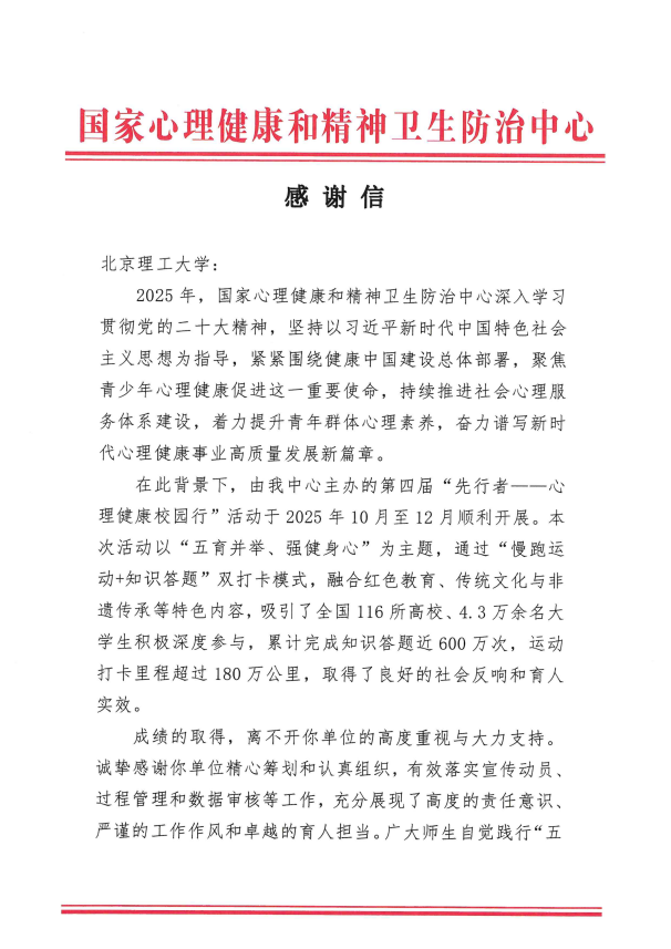 近日,北京理工大学收到来自国家心理健康和精神卫生防治中心的感谢信。信中对我校在第四届 “先行者 —— 心理健康校园行”活动中的突出表现给予高度赞誉,对师生积极践行健康理念、助力校园心理健康事业发展的行动表示充分肯定。